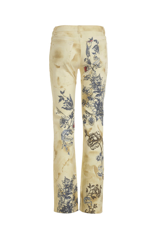 Roberto Cavalli cream denim jeans with flaming heart and tiger print
