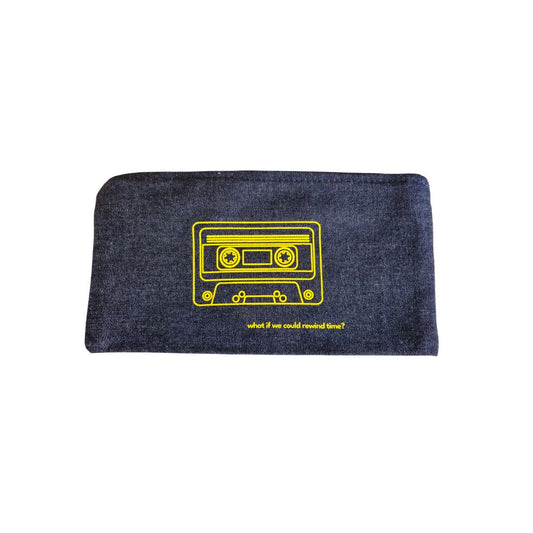 What if we could rewind time? Retro Mix-tape Cassette printed denim cosmetic/pencil case.