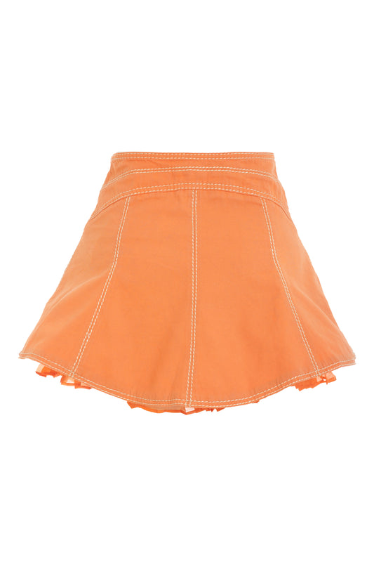 Roberto Cavalli orange distressed denim skirt with white stitch details